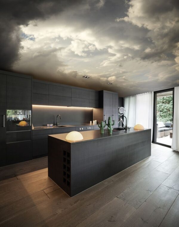 Plafond tendu avec un design unique représentant un ciel nuageux, offrant une ambiance à la fois apaisante et majestueuse.