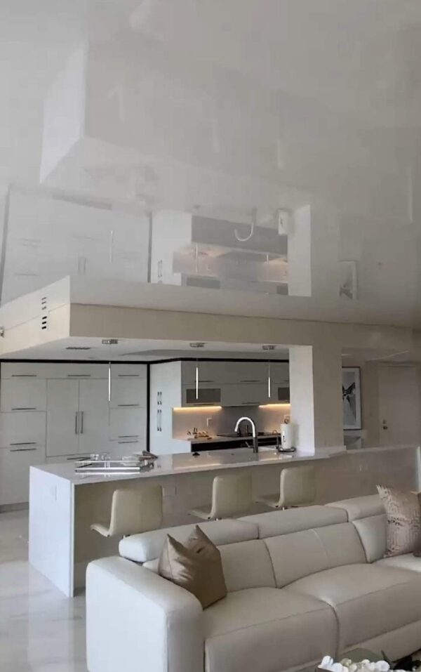 Plafond tendu brillant, créant un effet miroir subtil et élégant